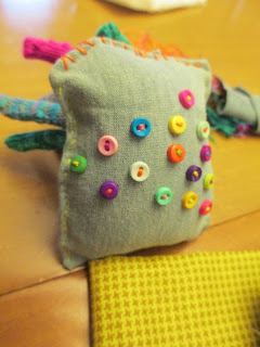 Today I have been tweaking the small spikey guy. I think this will be the ONLY small spikey guy I make -- I am really really tired of getting poked with the needle. This fabric is the major problem as far as I can tell. It doesn't like to be sewn. It must have to do with the color-changing process or something. I will be very lucky if tonight is the end of the needle mishaps...geez.
