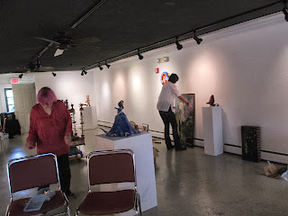 Wow -- the day finally arrived -- time to hang the show. I could not have done it without the help of Joan, Leann, and Patti. I did very little of the actual hanging myself...I am still learning. I need to go back in the morning to add all of the artwork labels, the artist statements, and do some minor repair on a couple of pieces. Then it is shopping time for the Opening Reception and going to Sorella's Bakery to pick up Monica's generous donation -- more about all of that tomorrow. Here is a quick look at the early stages.